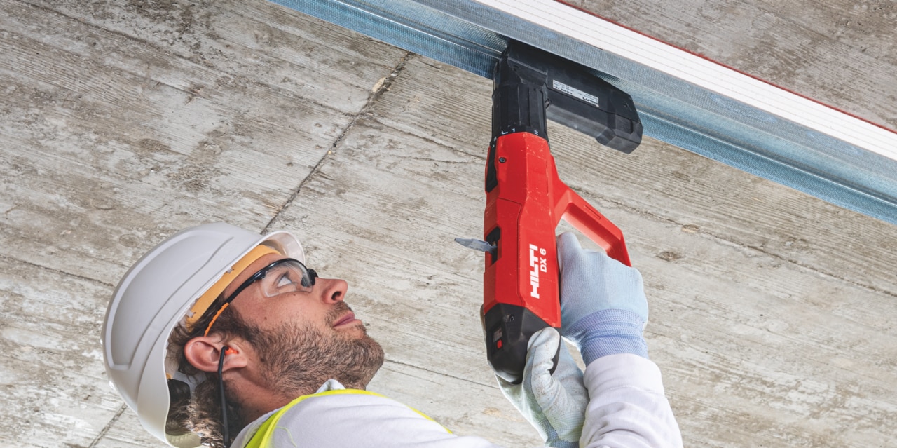 La presenza di raccordi a soffitto scorrevoli è prevista sempre più spesso. Con l'inchiodatrice DX 6 e il chiodo X-X caricato per calcestruzzo duro, potete risparmiare fino al 90% del tempo necessario per la tassellatura e lavorare completamente senza polvere. Abbiamo testato il sistema assieme a Knauf e il test ha avuto esito positivo.