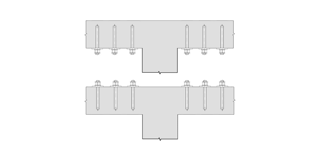 - Vergrösserung der Auflagerflächen durch die Kombination aus HCC-Serie (HCC-K, HCC-B, HCC-HUS4, HCC-U) und nachträglich installierten Bewehrungsstäben.